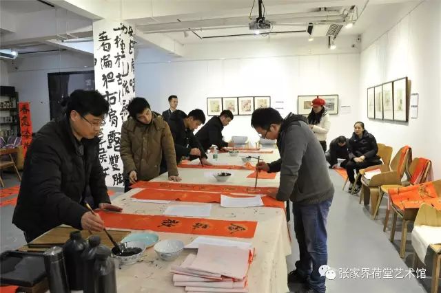 义写春联送祝福 翰墨飘香进万家 春节贴春联,是中华民族一直延续的传统,象征着吉祥如意,是人们表达向往美好生活的一种民族风俗。小年夜,张家界荷堂艺术馆“2017迎新春·送春联”活动在荷堂艺术馆举行。中国书法家协会会员、张家界市书法家协会名誉主席郭汉义,中国美术家协会会员、中国书法家协会会员、荷堂艺术馆馆长启琼,荷堂艺术馆创办人李建春,湖南省书法家协会会员、张家界市直书法家协会副主席宋世勇,大观书画培训学校校长李宗粒及成人班学员吕鹏、杨庚陆、禹荣志,博艺书法培训学校校长杨统钊,“小小书法家”李珂睿等数十位书法家及书法爱好者现场书写春联。市委宣传部副部长卢晓珊携家人参加了此次活动。