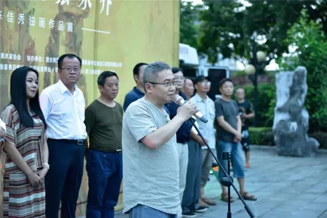8月4日,由张家界荷堂艺术馆策划主办的“洪荒世纪张家界· 陈佳秀油画作品展”终于拉开序幕。下午七点半在艺术馆广场举行了隆重的开幕式,张家界市人民政府副秘书长秦平武、张家界市文联党组书记、主席刘晓平、张家界市政协文史委主任石继丽、张家界市委宣传部文产办主任张世炎、吉首大学美术学院教授舒湘汉、吉首大学张家界学院党委书记王宾吾等领导及来自全市社会各界的艺术爱好者、艺术家、收藏家、企业家、中小学生参加了展览开幕式,市人民政府副秘书长秦平武宣布展览开幕。在宣布展览开幕的同时一楼展厅随即响起了悠扬的音乐声,参观展览的朋友们在舒缓的音乐声中端起手中的红酒杯祝贺陈佳秀的油画作品展览圆满成功,同时也为能欣赏到与自己内心深处产生共鸣的艺术作品而绽放出满面的认可和满足。很晚了,展厅里偶尔间还可闻一两声清脆的不枉此行的觥筹交错声,展厅外,一轮新月当空,缕缕清风在深情的与观众一一道别,展览开幕的第一天就这样以观众满心的欢喜和充实画上了一个圆满的句号。