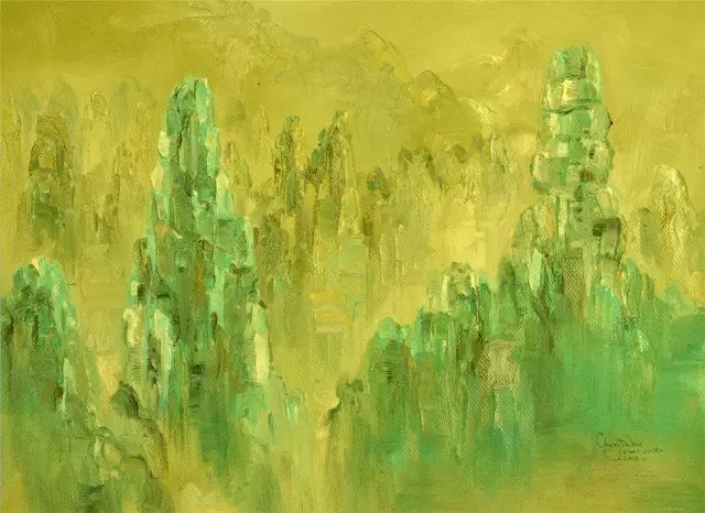 陈佳秀的油画是属于浪漫主义的,她笔下的“张家界”具有鲜明的个性特征,显然她的个性特征又不是针对视觉感受而孤立的对绘画艺术形式的纠缠不舍,而是以表达触动内心深处那种深刻的感受作为终极诉求所营造的具有生命迹象的图式。她把现实自然中张家界三千奇峰八百秀水经过联想虚拟化后运用沉稳而表达准确的色彩,流畅而激情恣肆的笔触呈现出了一个似乎刚从上帝手中诞生的未经历史打磨的“张家界”,一个远离世俗、远离喧嚣、远离功利、远离纷争、远离尔虞我诈、远离虚伪的张家界,一个你我都愿意回归此处的张家界!