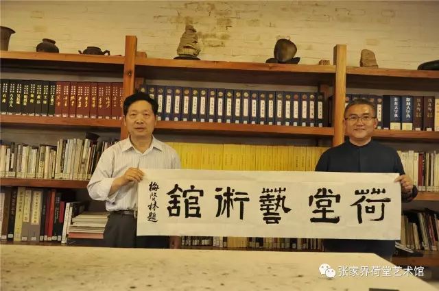 梅启林先生在对荷堂艺术馆的基本情况有了一定的了解后,对荷堂艺术馆的发展思路非常赞同,并给出了高屋建瓴的建议,在场的各位艺术家也都为荷堂艺术馆为当地文化艺术事业所做的贡献以及为全国美术书法界的朋友提供如此完善的交流平台给予了高度的评价,并希望在恰当的时候来张家界荷堂艺术馆举办个人画展或者联展,座谈会在轻松愉快的氛围中结束,临行前,梅启林先生和河北省美协副主席颜景龙先生有感于荷堂艺术馆对文化艺术事业的奉献精神,挥毫泼墨分别为艺术馆题写了“荷堂艺术馆”和“翰墨铸情”。