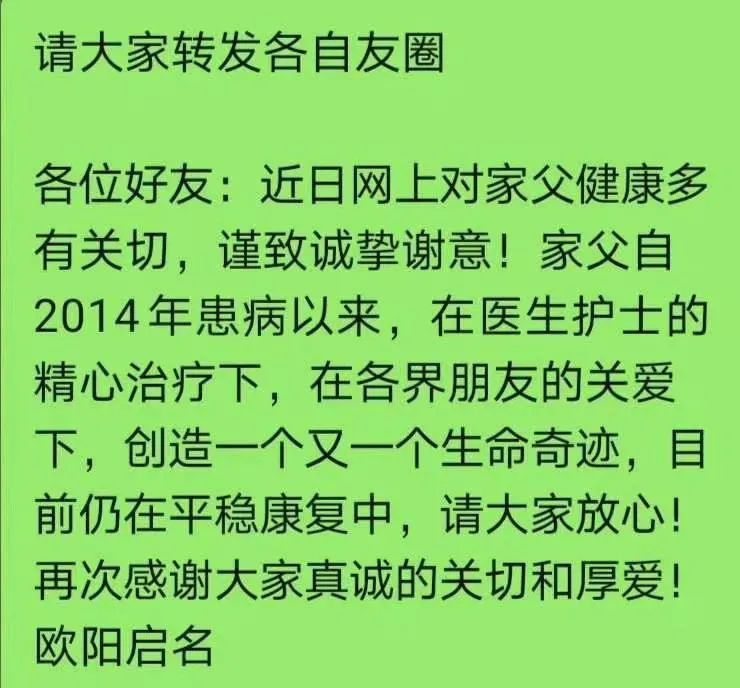 首先,最令人欣慰的是网上所传为虚假消息,经欧阳中石女儿欧阳启名证实先生仍处于疗养康复阶段。这则闹剧到此也水落石出,划上句号。