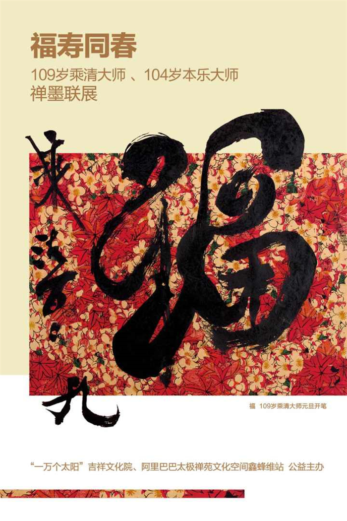 2021年春节来临,一万个太阳吉祥文化院、东方文化艺术研究院、酱爆、阿里巴巴太极禅苑文化空间鑫蜂维站联合主办《福寿同春——109岁乘清大师、104岁本乐大师禅墨联展》,2021年2月1日在阿里巴巴太极禅苑文化空间鑫蜂维站开幕。